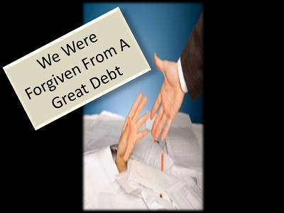 Mat 18:23-35 (NIV) “Therefore, the kingdom of heaven is like a king who wanted to settle accounts with his servants. As he began the settlement, a man who owed him ten thousand talents was brought to him. Since he was not able to pay, the master ordered that he and his wife and his children and all that he had be sold to repay the debt. The servant fell on his knees before him. ‘Be patient with me,’ he begged, ‘and I will pay back everything.’ The servant’s master took pity on him, canceled the debt and let him go. ” |